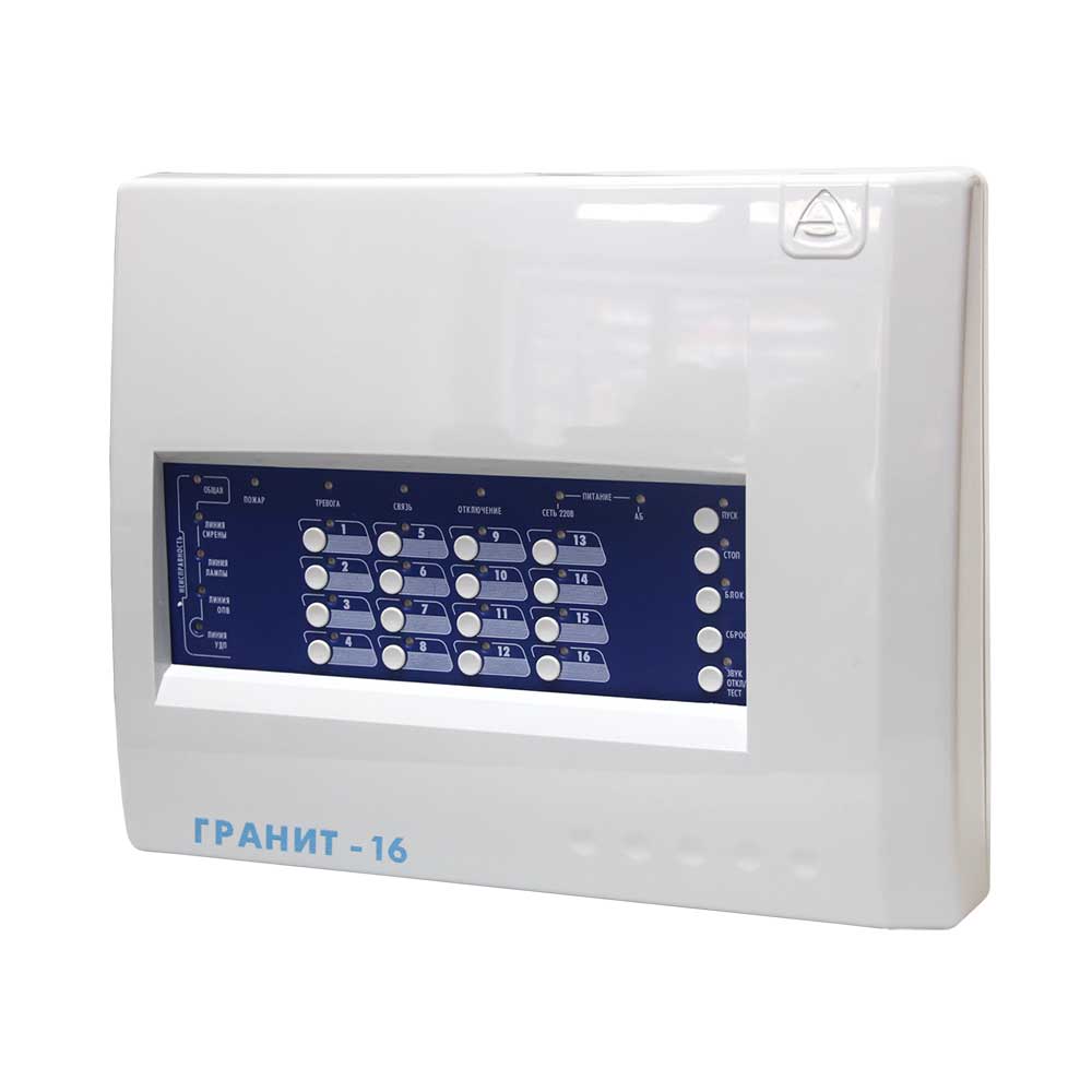 Контрольный прибор «Сибирский Арсенал» «Гранит-16» рассчитан на шестнадцать охранных или пожарных шлейфов сигнализации. Оповещает о тревоге и других событиях с помощью световых и звуковых оповещателей, табло «Выход». Поддерживает все алгоритмы работы (А, В и С) согласно свода правил СП 484.1311500.2020 «Системы противопожарной защиты. Системы пожарной сигнализации и автоматизация систем противопожарной защиты. Нормы и правила проектирования» (01.03.2021 г).