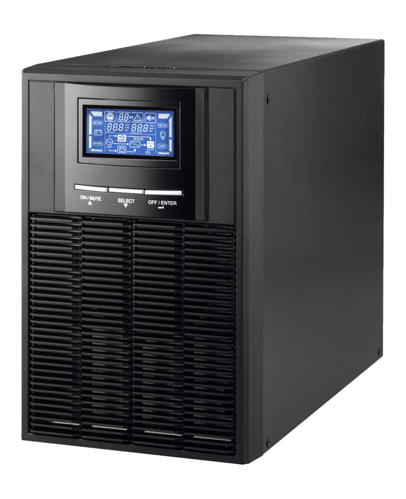 Встроенная АКБ для резервного питания не предусмотрена. Для автономной работы нужен внешний блок аккумуляторных батарей емкостью до 250 А·ч (напряжение — 12 В, ток заряда — 12 А). UPS оснащен дисплеем для визуализации уровня нагрузки и заряда АКБ, неисправности линии, текущего режима работы, перегрузки, системных сбоев etc.