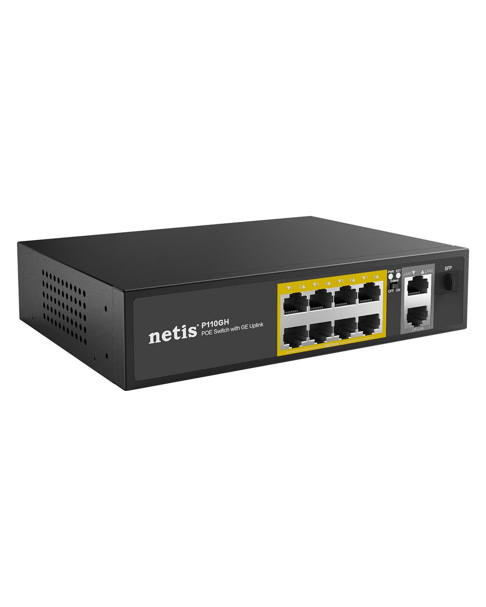 Неуправляемый коммутатор Netis P110GH оборудован восемью PoE-портами RJ-45 Fast Ethernet, двумя Uplink-портами RJ-45 (одновременное подключение регистратора и маршрутизатора) Gigabit Ethernet, SFP-слотом для внедрения в оптоволоконную сеть (SFP-модуль в комплект не входит). При бюджете PoE 100 Вт подает на порт до 30 Вт.