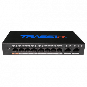 Коммутатор TRASSIR TR-NS1010-96-8POE представляет собой неуправляемый PoE-коммутатор, оснащённый восемью портами RJ-45 с поддержкой PoE (Power over Ethernet) и двумя гигабитными uplink-портами.