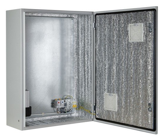 Навесной шкаф, предназначенный для размещения электротехнического оборудования, оснащен пассивной системой вентиляции с помощью вентиляторных решеток и защитным реле от "холодного пуска".