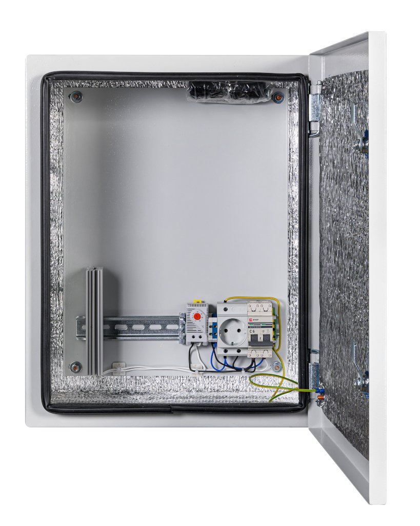 Шкаф монтажный универсальный с монтажной платой и двумя замками; два гермоввода (MG-25), внутренние размеры 377х477х190 мм (ШхВхГ); IP66, t-раб.-55…+50°С, 400х500х220 мм (Ш×В×Г), 10.3 кг. Цвет серый. В комплекте: утеплитель из порилекса, замок 2 шт,ключ 1 шт, монтажная плата 1 шт, гермовводы 2 шт (MG-25), розетка 1 шт, автоматический выключатель, 6А 1 шт, клемма для подключения оборудования 2 шт, клемма заземления 1 шт, термореле 1 шт, нагреватель мощностью 75 Вт 1 шт.